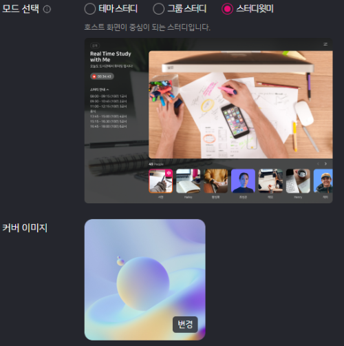 ㄴ 스터디 제목 / 모드 선택 / 커버 이미지 / 카테고리 설정