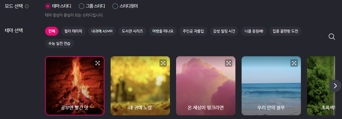 1) 테마스터디 : 테마 영상이 중심이 되는 스터디로 참가자의 화면이 main이 아님