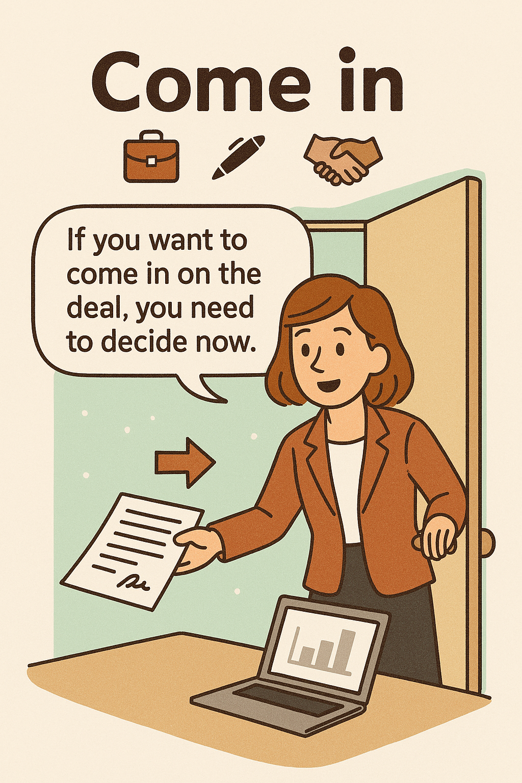 📍 come in – 들어오다 / 관여하다 / 유행하다