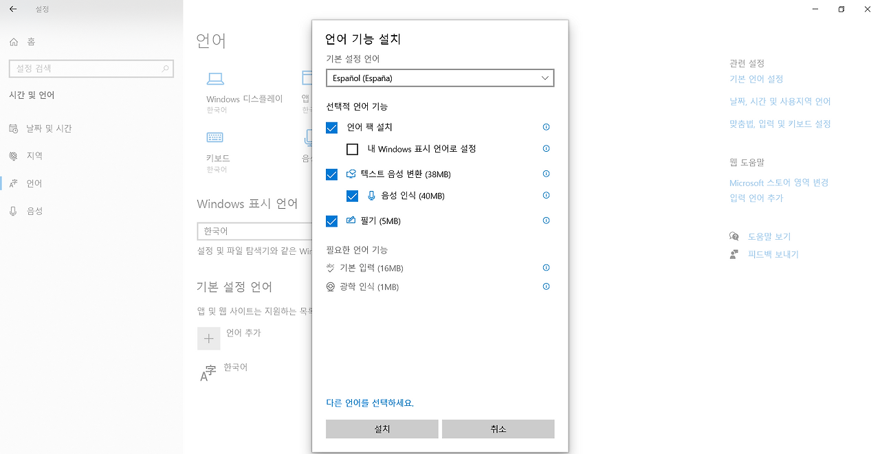 기본 설정 언어에 '한국어' 외에 '스페인어'를 추가해줘야 함.