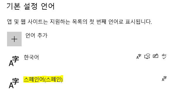 📍 '기본 설정 언어' 에서 [+] '언어 추가' 클릭 > '스페인' 입력