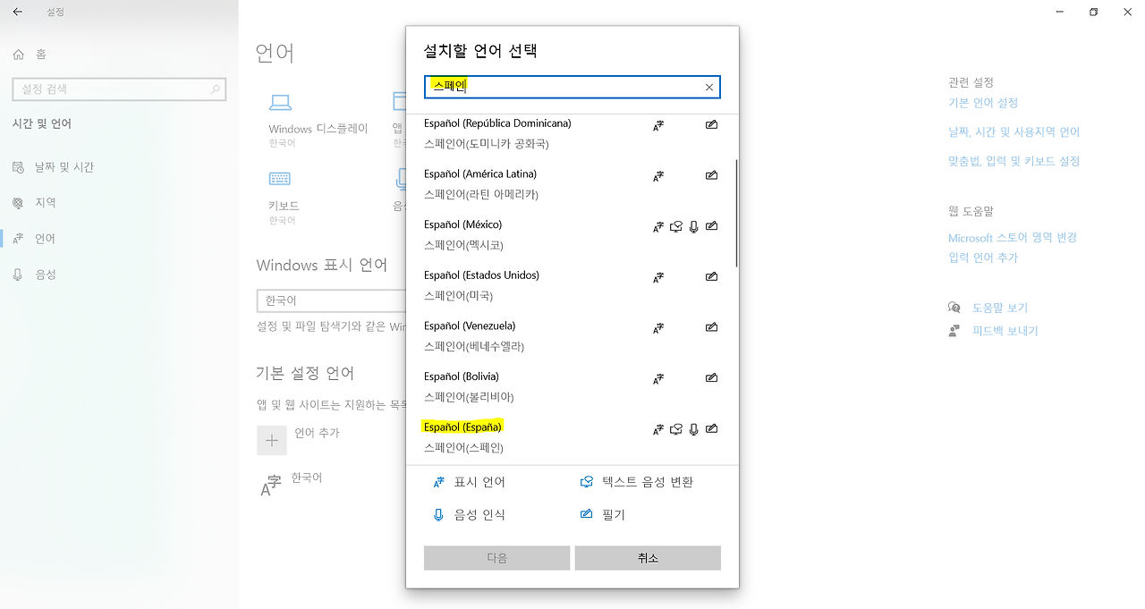 기본 설정 언어에 '한국어' 외에 '스페인어'를 추가해줘야 함.