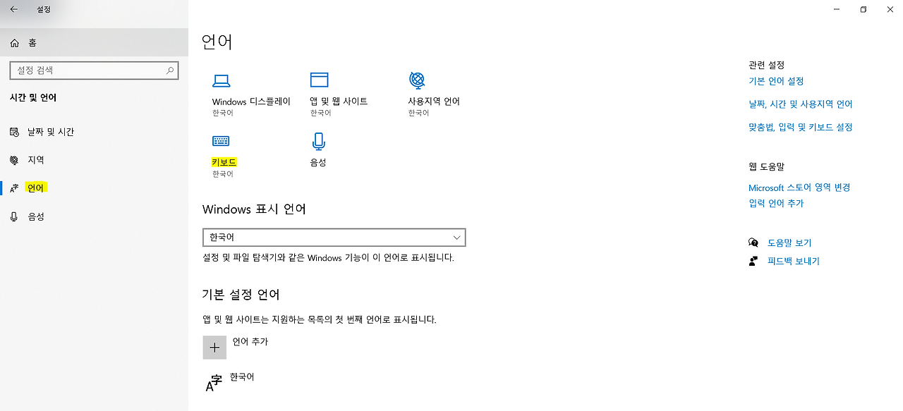 📍 좌측 메뉴 바에서 '언어' > '키보드'에 현재 '한국어'로 되어 있음